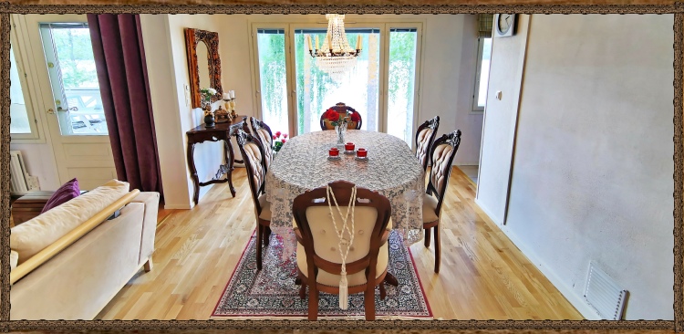 ruokailutila jossa pyöreä pöytä kuudella tuolilla, olohuone jossa